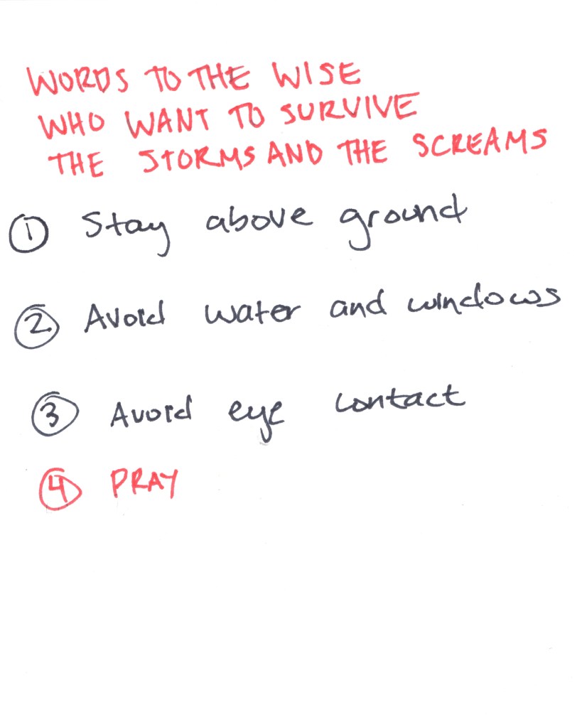 Gretchen’s voice stays low. Rough from dehydration. Sanders blinks at the afternoon again, seeing the deep green canopy of trees out the grimy storehouse window. Trying to get a better view of the sky and what it holds requires another shift in position. Gretchen pushes Sanders back down, covering Sanders’ mouth as they hiss.