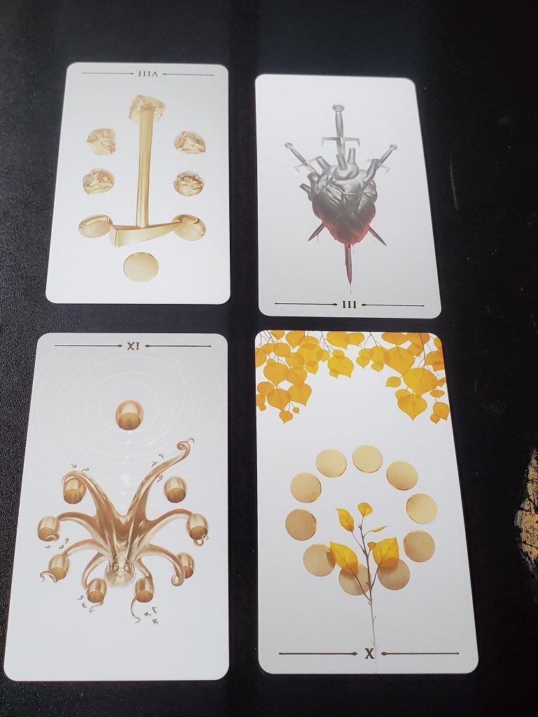 Ephemere Oracle Deck || (8 of Pentacles); 3 of Swords; (9 of Cups); 10 of Pentacles